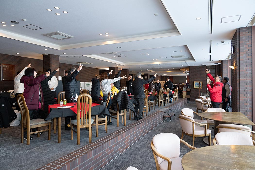午前のプログラムが終了し、寒さで消耗した体力を回復するためにランチ休憩へ。地元・美唄でお店を営むシェフがその場でエゾ鹿を焼くライブキッチンをはじめ、北海道の海と山の幸を一度に体感いただける料理をブッフェ形式でお召し上がりいただきました。ランチブッフェ後は走行プログラムが再開します。午後は「ステアリングワーク」「スポーティネス」「スノーモービルツアー」の3つのアクティビティを順番に体験いただきました。