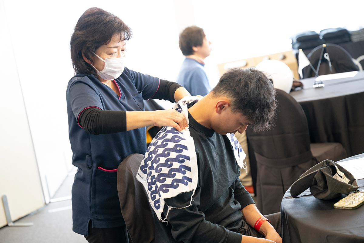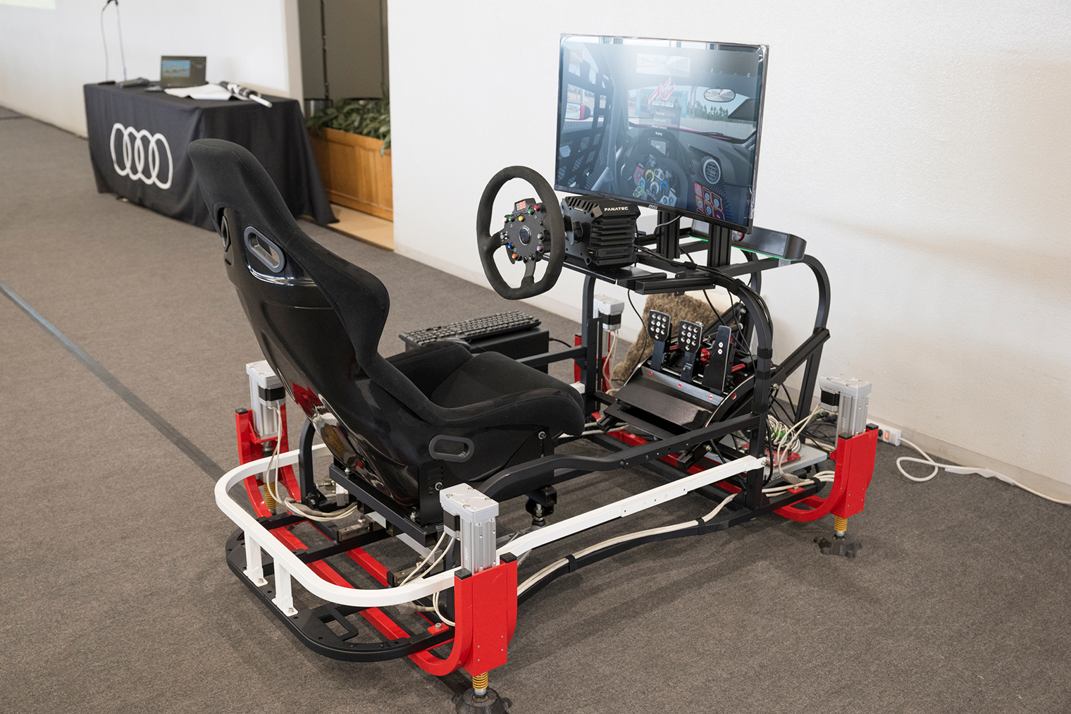 今回は、休憩中のコンテンツを2つご用意しました。1つ目は、クイックマッサージ。走行で力の入り、固まった肩や背中をほぐし、万全な状態で走行に挑んでいただきました。もう一つは、ドライビングシミュレーター。世界各地のコースをAudiで走行いただけるシミュレーターで、実際の走行で学んだ知識や経験を活用していただき、世界各地のレーシングコースを疾走していただきました。