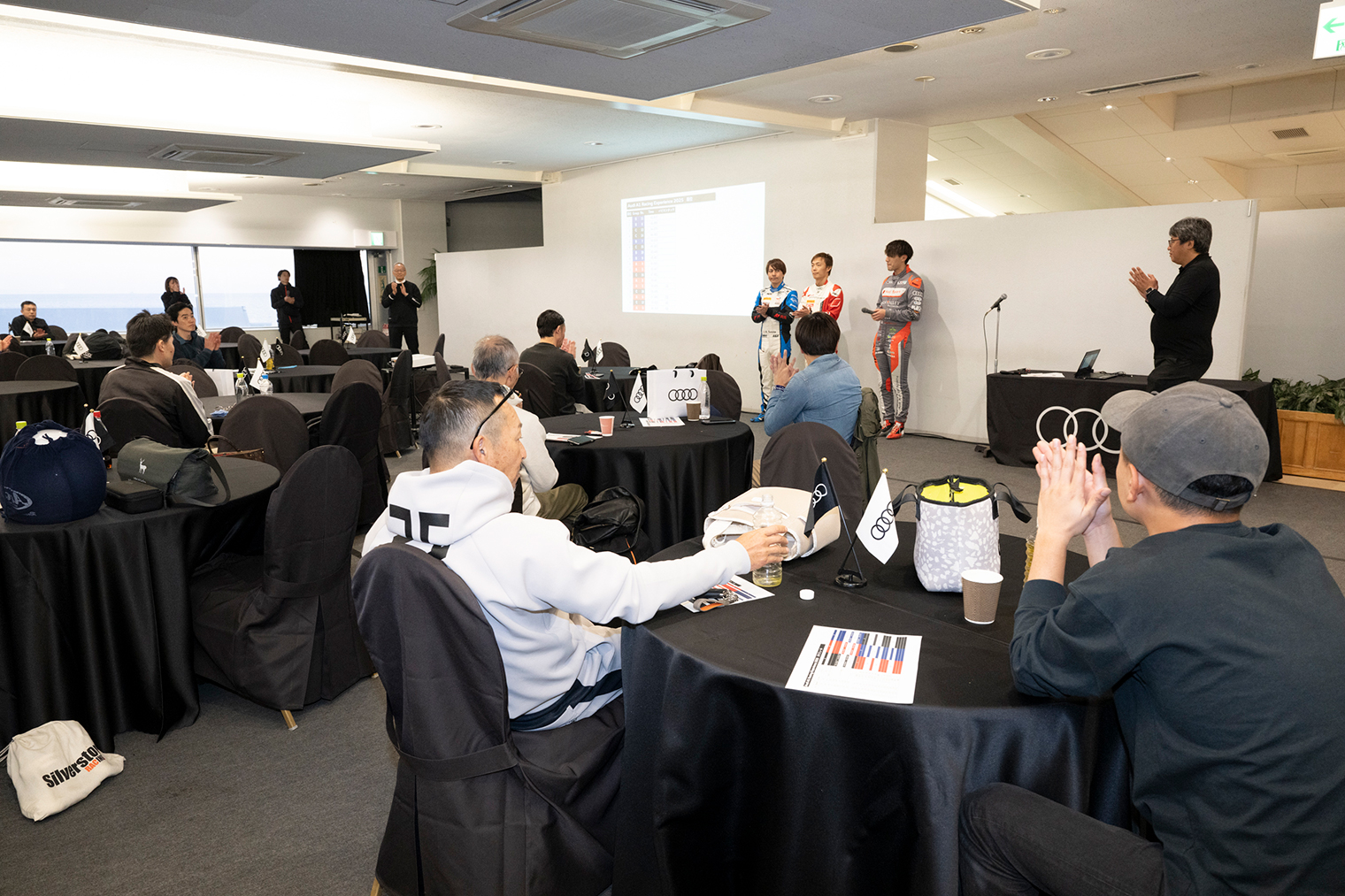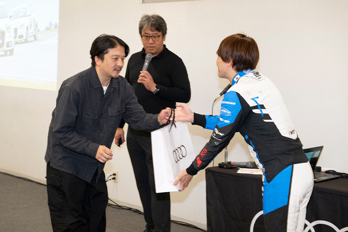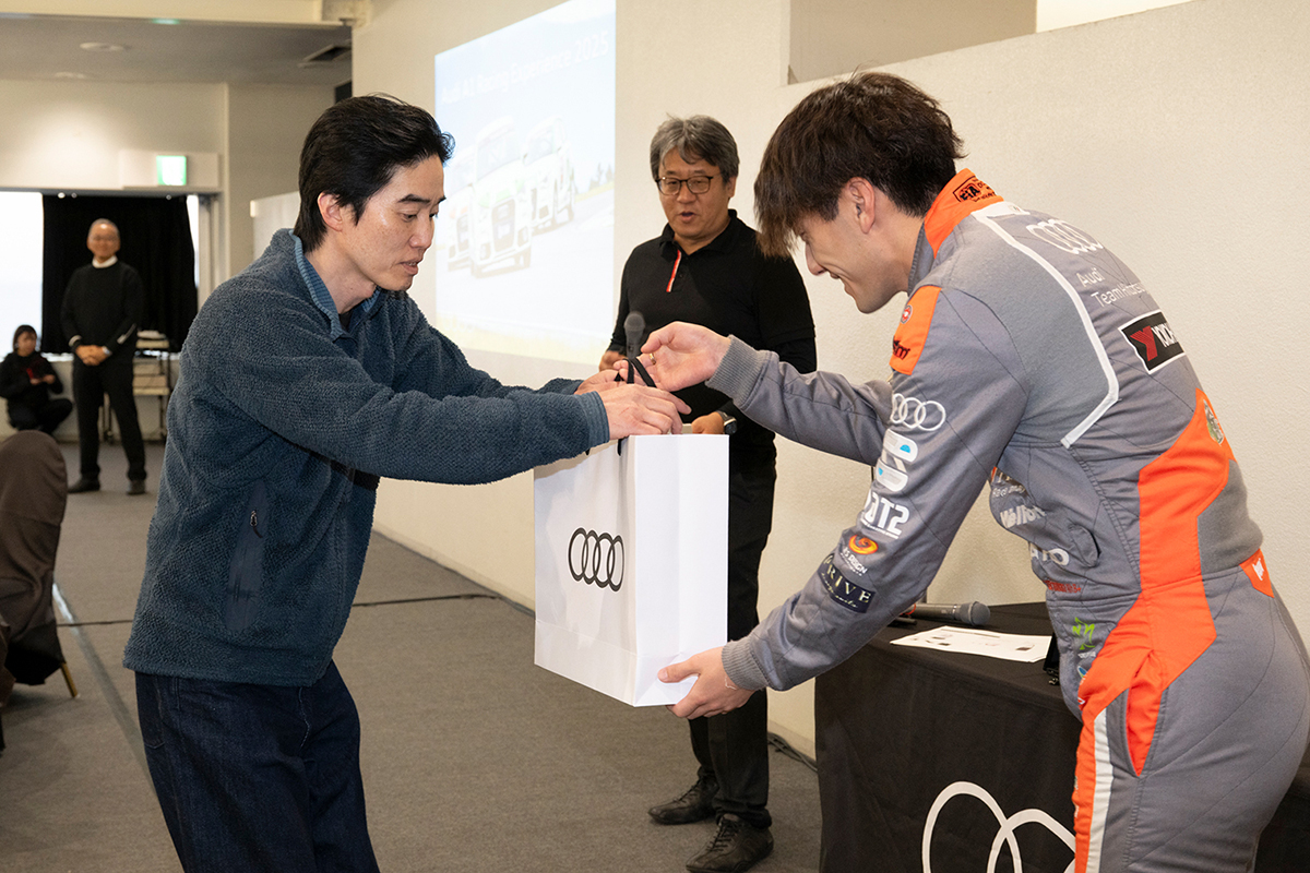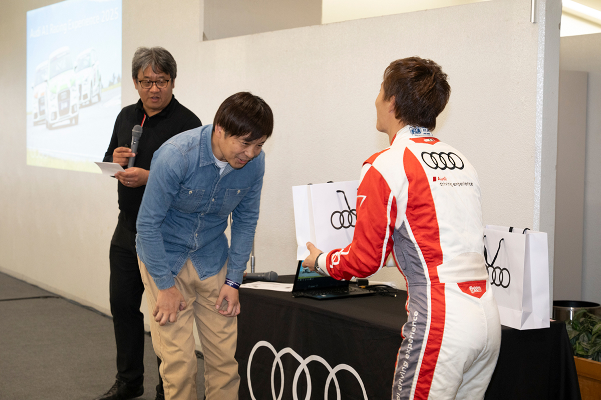タイムアタック後に、1日の走行を振り返りながらフリー走行をしていただき、その後、表彰式を実施しました。上位3名の方にはAudiオリジナルグッズを贈呈。優勝された方のコメントでは「落ち着いた運転を心がけたおかげで、練習の成果を出すことができた」とのコメントいただきました。インストラクターや主催者からの総評とともに、「Audi A1 Racing Experience 2025」は幕を閉じました。