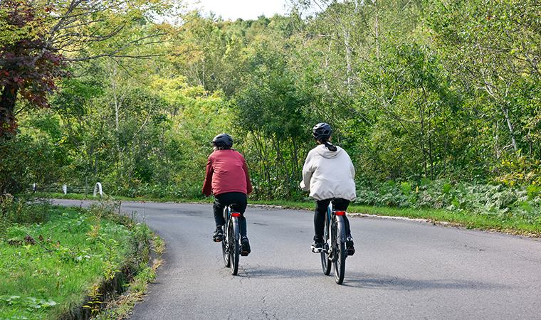 e-Bikeで自然の中を気持ちよくサイクリングしながら、奥志賀高原周辺を散策。坂道や長距離ライドでは電動アシストでラクに走り抜けることができます。