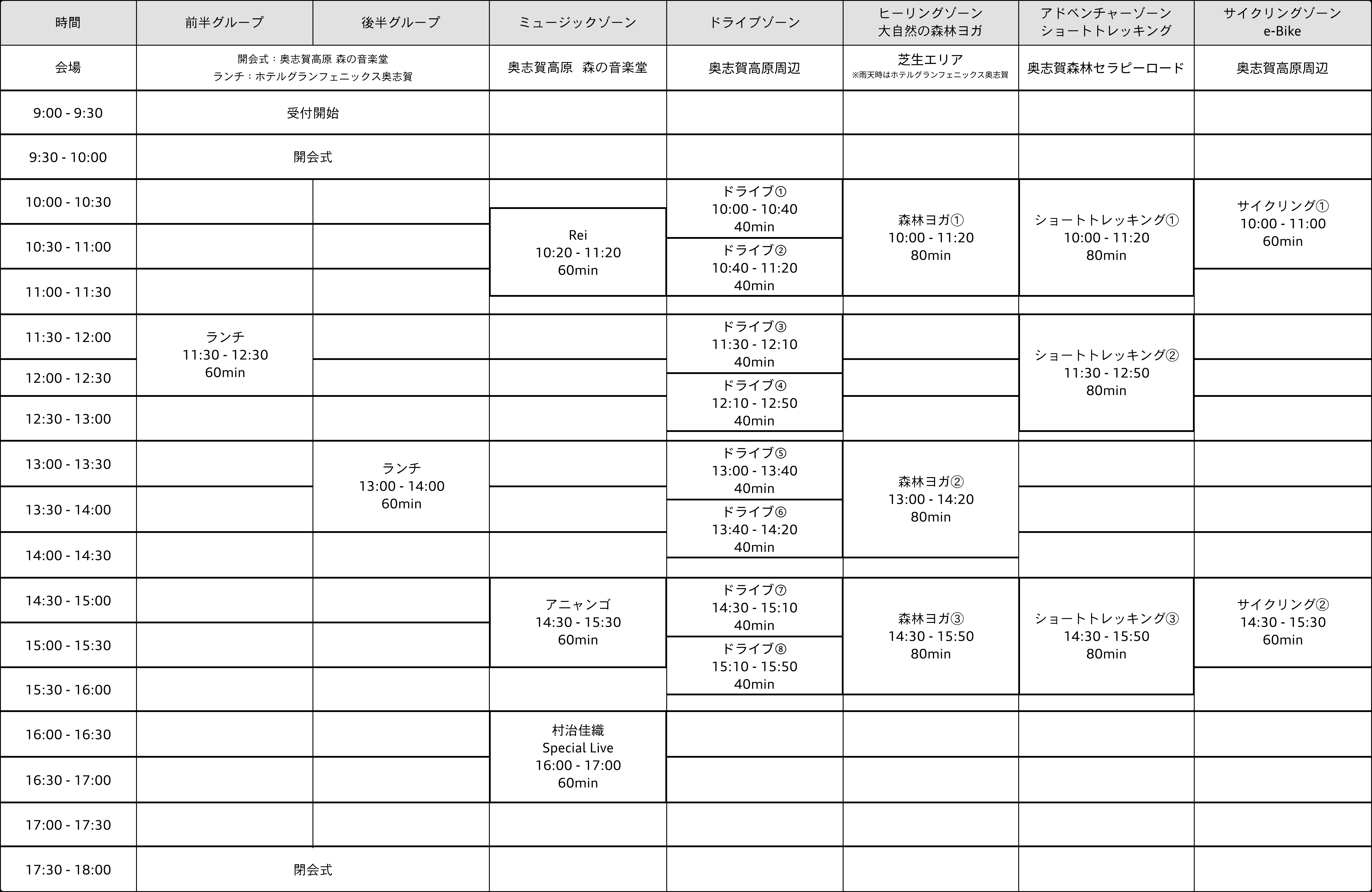 | 会場 | ホテルグランフェニックス奥志賀 | 13:00 - 13:40 | 試乗➀ |