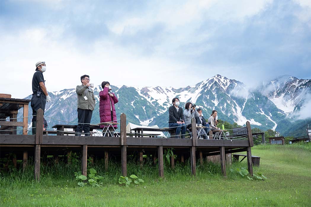 食後は焚き火バーで、思いおもいに時を過ごしていただきました。高原の澄んだ夜気の中、揺れる炎を囲んで談笑するのはアウトドアの醍醐味です。白馬八方温泉の露天風呂で疲れを癒やし、一日目は終わりました。