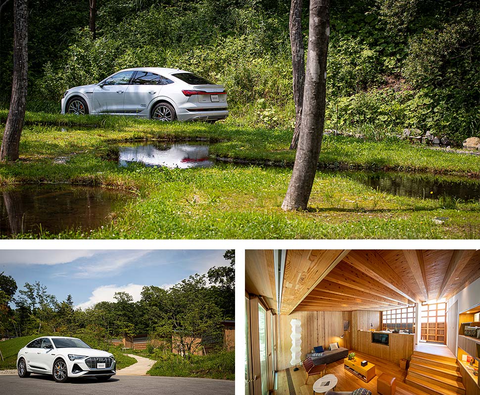 美しい木々と澄んだ水に恵まれた那須山麓・横沢の地にひらかれたサステイナブルでエシカルなリゾートは、Audi e-tronと呼応する場所。幻想的な美しさを放つランドアート「水庭」や五感を刺激するアートフードを提供するレストラン、暮らすように滞在できるホテル棟など、やすらぎのひとときをもたらします。